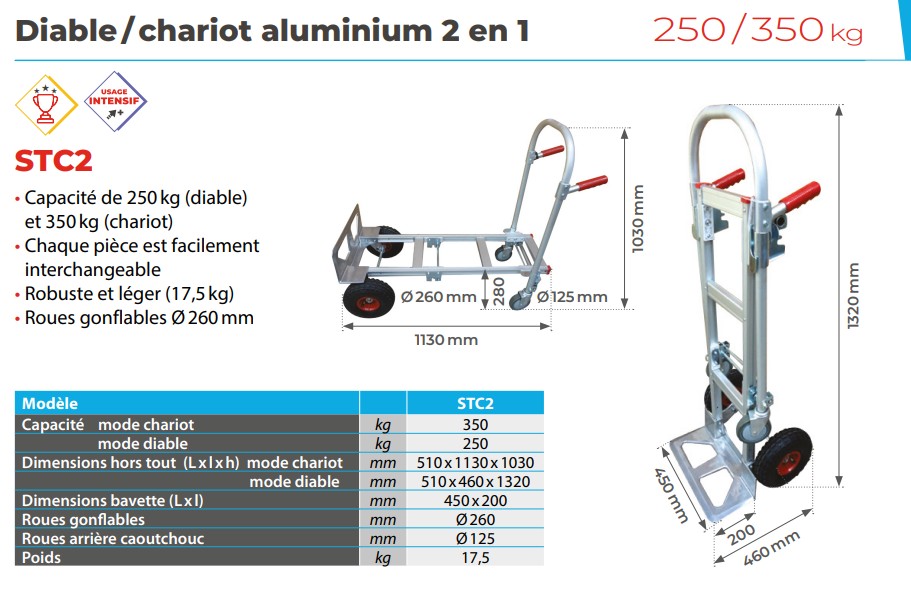 - Capacité mode diable : 250 kg
