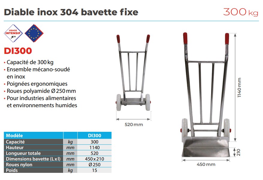 Le DI300 est un diable entièrement soudé en acier inoxydable, spécialement conçu pour les environnements humides ou l'industrie agroalimentaire. Ce diable peut supporter des charges jusqu'à 300 kg avec des roues en polyamide de Ø 250 mm et une bavette fixe entièrement soudé en acier inoxydable.