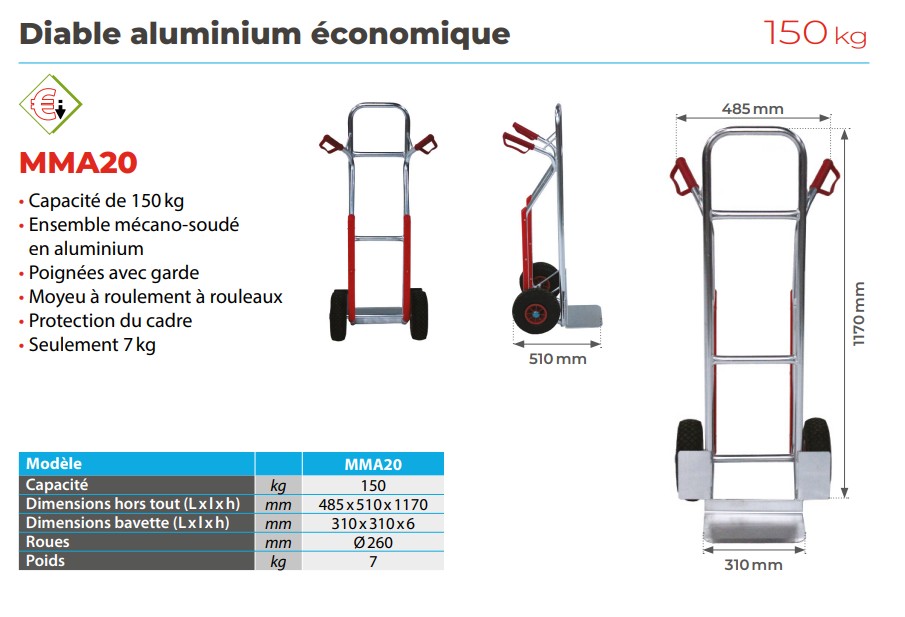 Économique, le diable aluminium MMA20 peut déplacer des charges de 150 kg. L’ensemble de sa structure est mécano-soudée. Ce diable dispose de poignées avec garde brevetées.