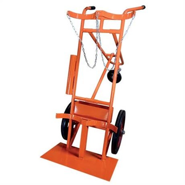 Ce diable est conçu pour transporter 2 bouteilles de toute taille. Il est équipé de grandes roues à bandage caoutchouc. La charge est maintenue sur la bavette à l'aide d'une chaîne de sécurité.